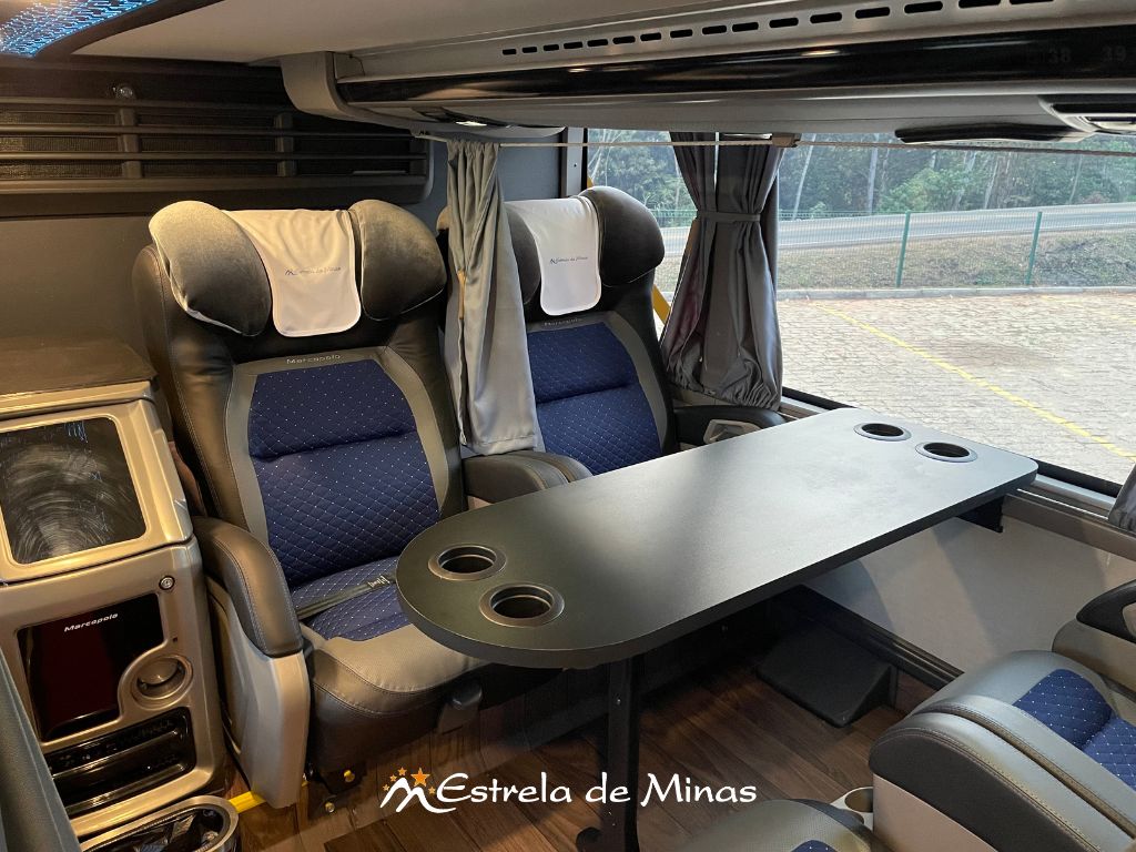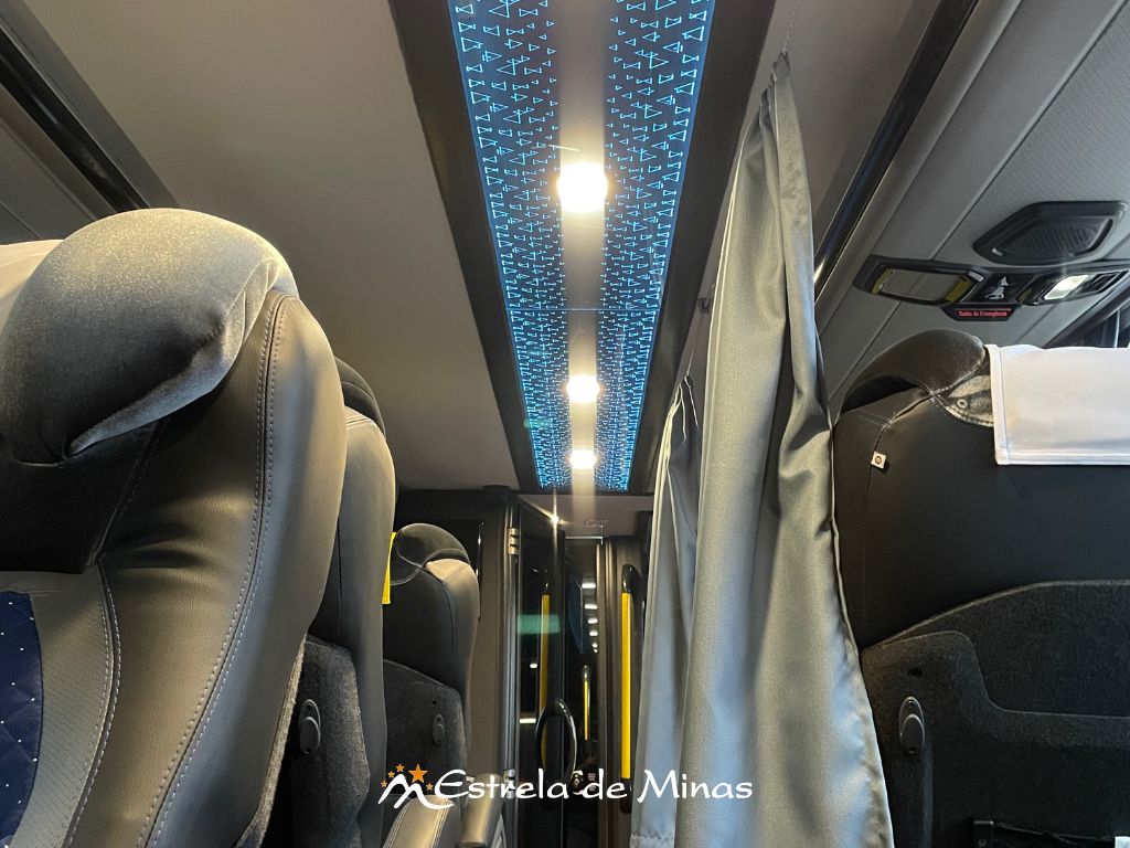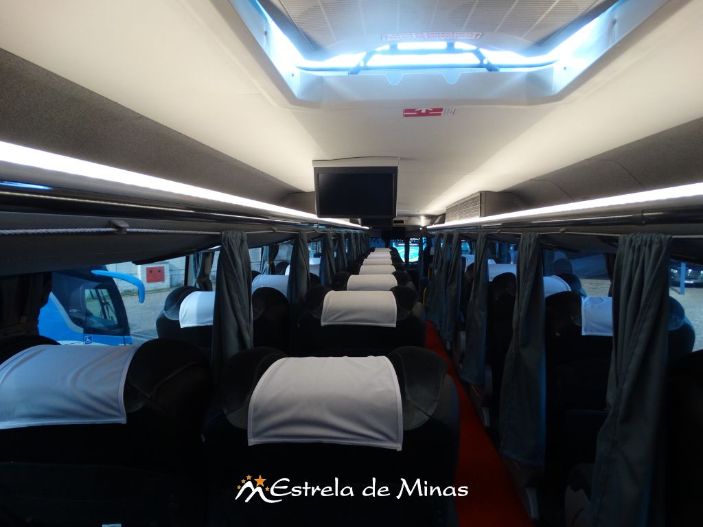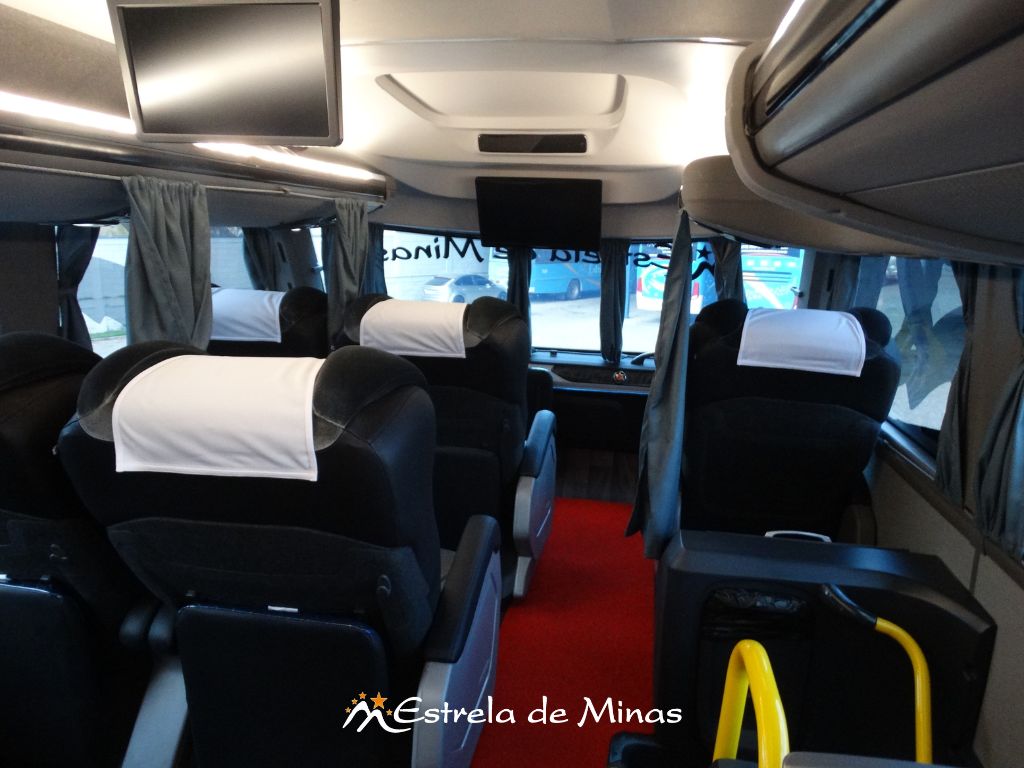Andar superior: 31 lugares, 04 Monitores de TV's com DVD e MP3 e 2 geladeiras elétricas.